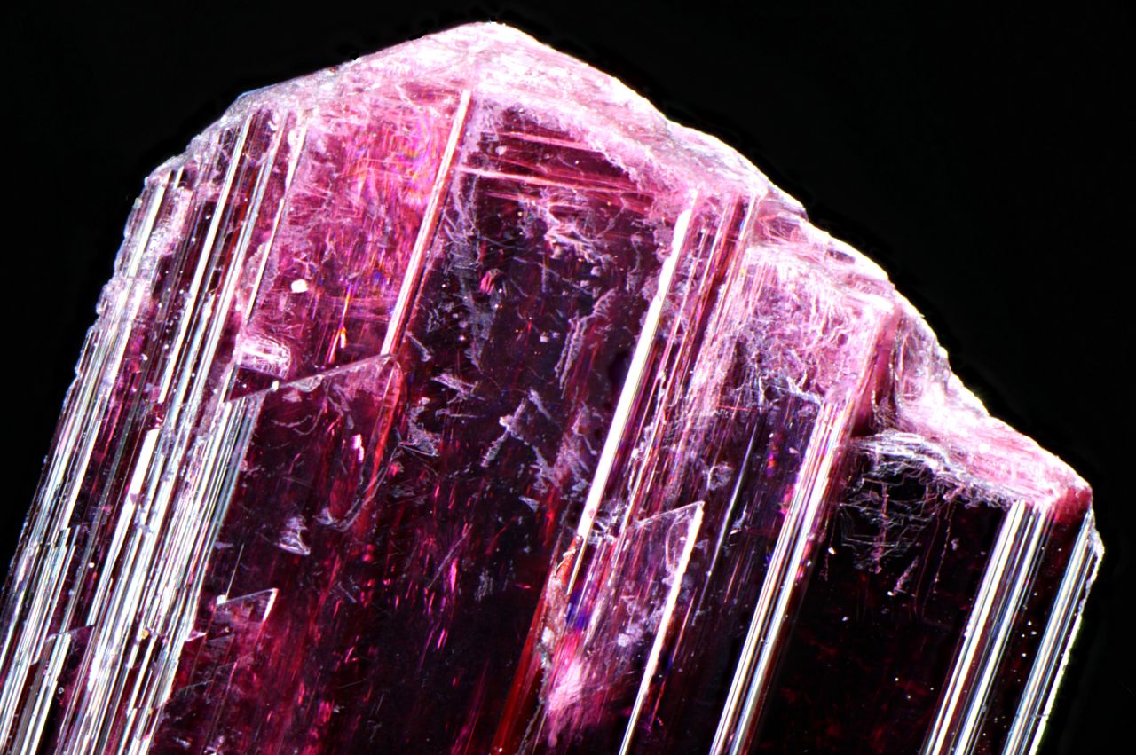 This specimen comprises very dark purple crystals of erythrite, but the tips of the crystals flare out a little and show up as a lighter shade of pink. Width of view 3.5mm. Stack of 20 images. Ex Brian Shelton Collection. Click on the image below for a higher resolution version.