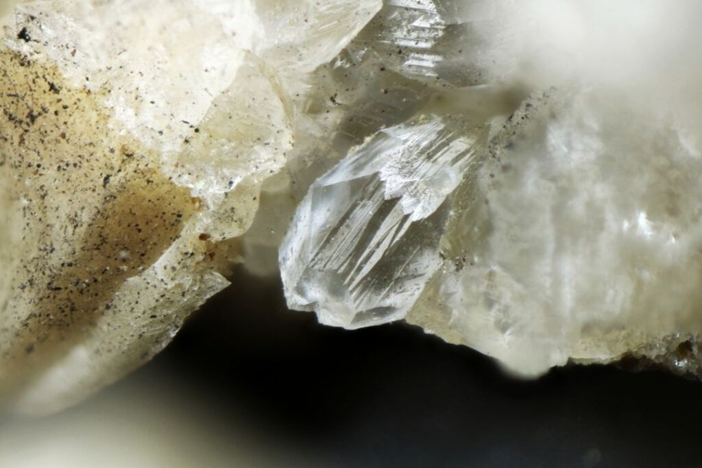 The Organ Pipes National Park is enclosed in two Cities: Hume to the north of Jacksons Creek, and Brimbank to the south. It is not known which side of the creek this specimen was collected from. Acquired by Joan Lamond in 1997 from Rob Hamson. Collected by Prof. R.A. Willis 11/1/1974. Width of view 3mm. Stack of 25 images (chabazite) and 31 images (thomsonite).