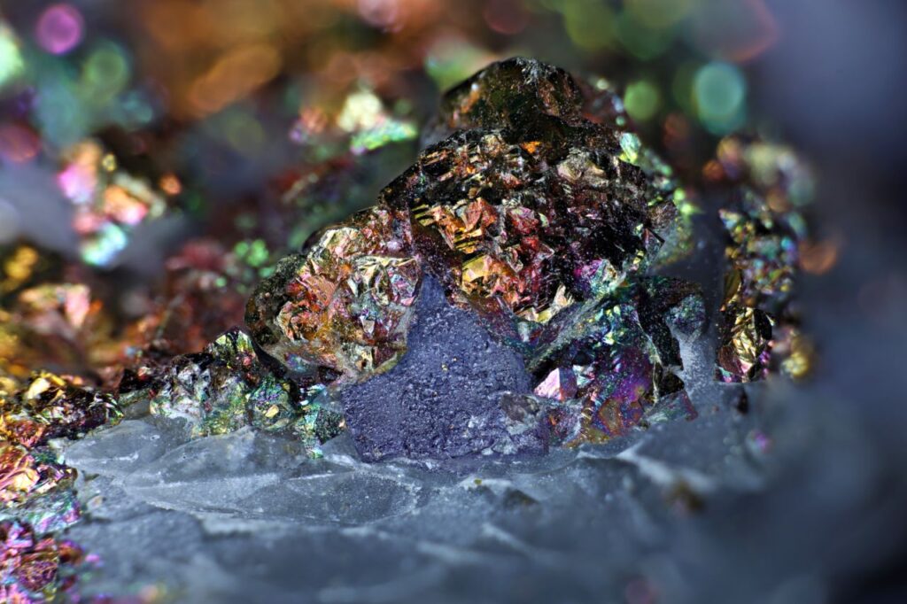 Lots of chalcopyrite crystals on small purple cubes of fluorite and red-fluorescing double-terminated calcite crystals. A few small yellow barite crystals also present. Even smaller pyrite crystals are sprinkled on the barite, and to a lesser extent, on fluorite and calcite crystals. Width of view 17.25mm.