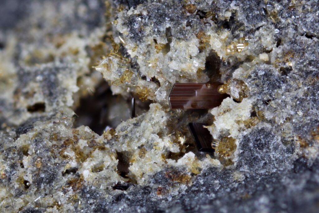 Lustrous red pseudobrookite crystals with yellow transparent enstatite crystals. The lustre is so good you can clearly see the reflections of other crystals. Ex Dick Haslam Collection. Width of view 2.5mm. Stack of 40 images.