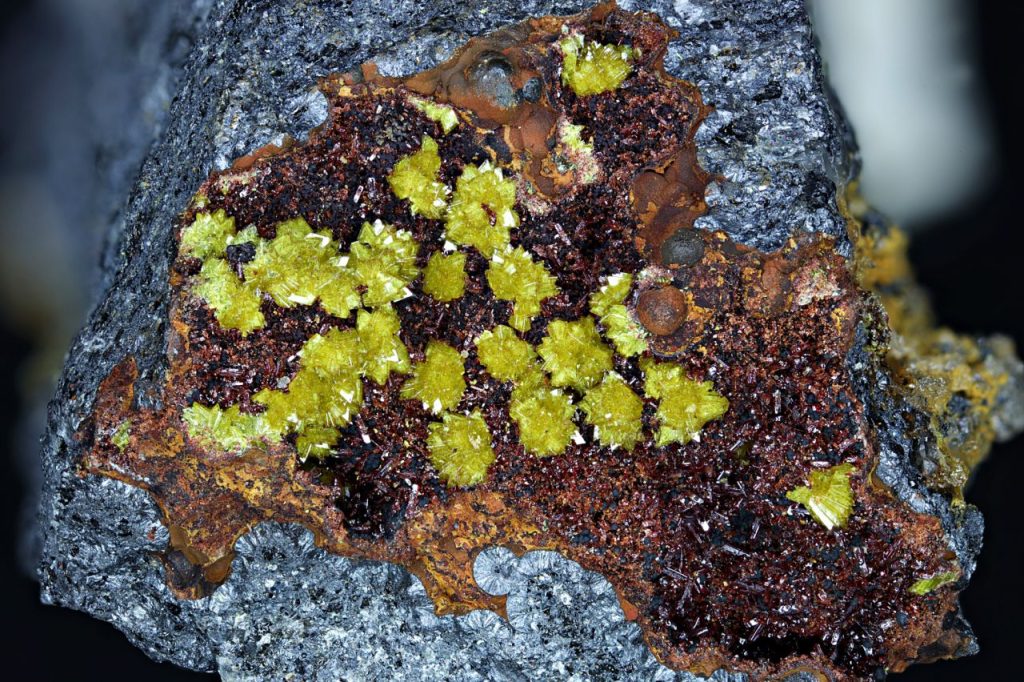 ncat PA24 Carminite, Beudantite-Segnitite, Kintore opencut, Broken Hill South Mine, Broken Hill, Broken Hill district, Yancowinna Co., New South Wales May 12, 2024 Pendleton Australasia Australia New South Wales Yellow scalenohedral crystal groups of beudantite-segnitite, with dark red carminite needles. Ex Ashleigh Watt Collection. Width of view 9mm. Stack of 70 images. Click on the image below for a higher resolution version.