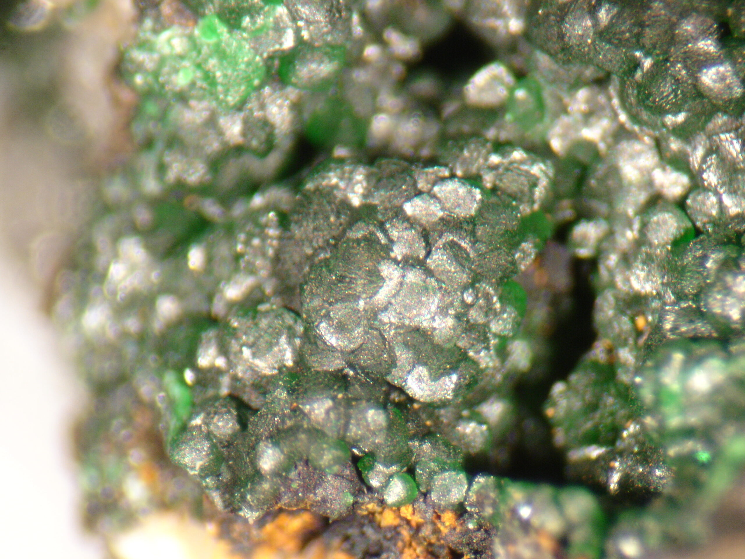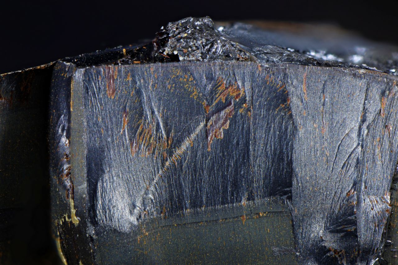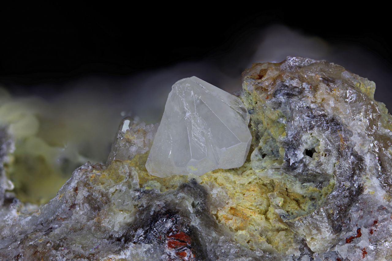 Yellow prismatic titanite crystals with dark green, black, and green pyroxene crystals, possibly ferro-katophorite(?), aenigmatite(?), and/or aegirine(?), in an albite vugh. Width of view 6mm. Stack of 100 images.