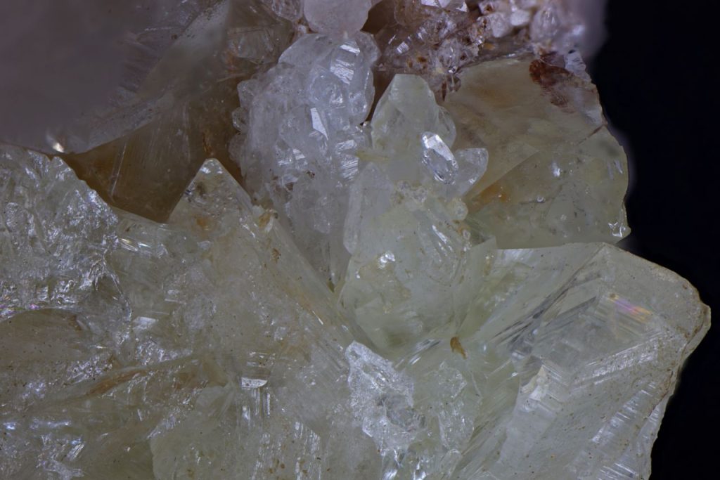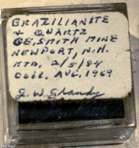 0456 Brazilianite, Quartz, G. E. Smith Mine (Chandler Mills Quarry), Newport, Sullivan Co., New Hampshire, USA December 19, 2021 Pendleton New Hampshire North and Central Americas United States Pale yellow brazilianite with colourless quartz collected in 1969, mounted Feb. 5, 1984, and from the renowned collection of J.W. Grandy. Width of view 5mm. Stack of 100. Click on the mineral image below for a higher resolution version. Click for full sized imageā¦