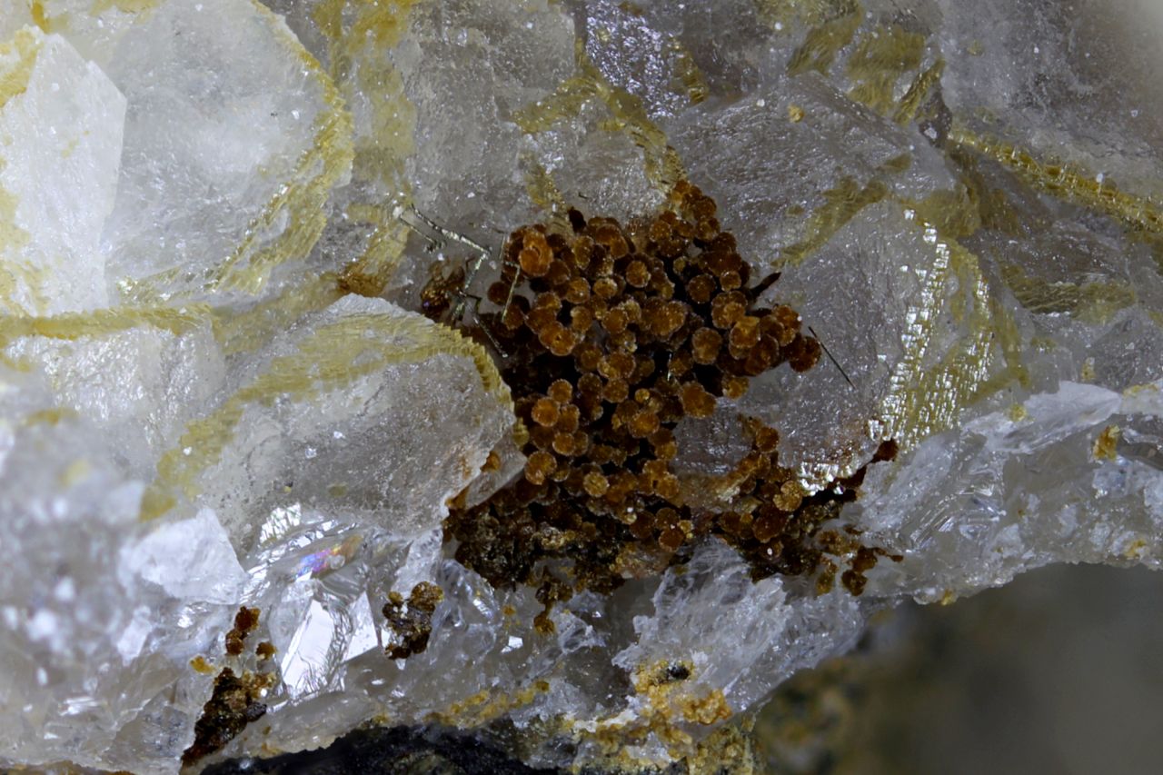 Another NEW SPECIES from this bizarre geological environment in Kamchatka, chrysothallite occurs as extremely small, bright golden yellow, equant micro crystals perched in scoria vugs, often with olive green belloite and occasionally other rare species such as deep green avdoninite, blue chlorothionite etc. Formula: K6Cu6Tl3+Cl17(OH)4*H2O, tetragonal, IMA #2013-008. Named for the Greek word for gold and in allusion to its essential thallium content, only the second mineral with species-defining trivalent thallium.