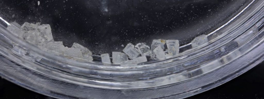 Crude cubes of halite found on the protected underside of a piece of broken crockery at a location known as “Treasure Beach”. Here, broken crockery and glass had been dumped in the early days of Old Hobart Town. Width of view 14.5mm. Stack of 35 images.