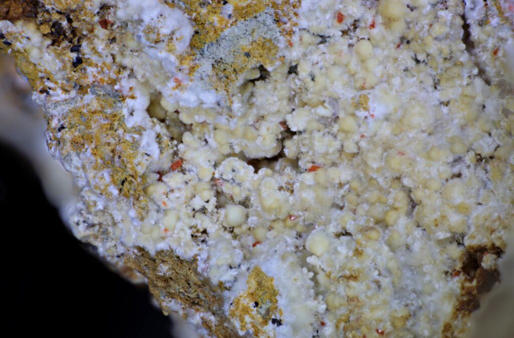 Creamy balls of dundasite with bright white tips to the crystals, and a few tiny crocoite crystals. Labelled as Red Lead Mine, this is clearly a Kapi Mine specimen. Ex Jo Price Collection. Width of view 11.5mm. Stack of 91 images.
