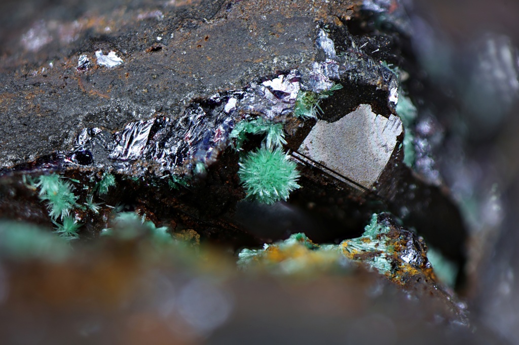 A neat little spray of malachite, roughly 0.6mm across, from the lesser-known Mineral Hill deposit, theĀ Iodide Mine (Mount Iodide Mine), Mineral Hill field, Condobolin district, Kennedy Co., New South Wales. Also present on the specimen – copper, cuprite, goethite and a few flecks of azurite.