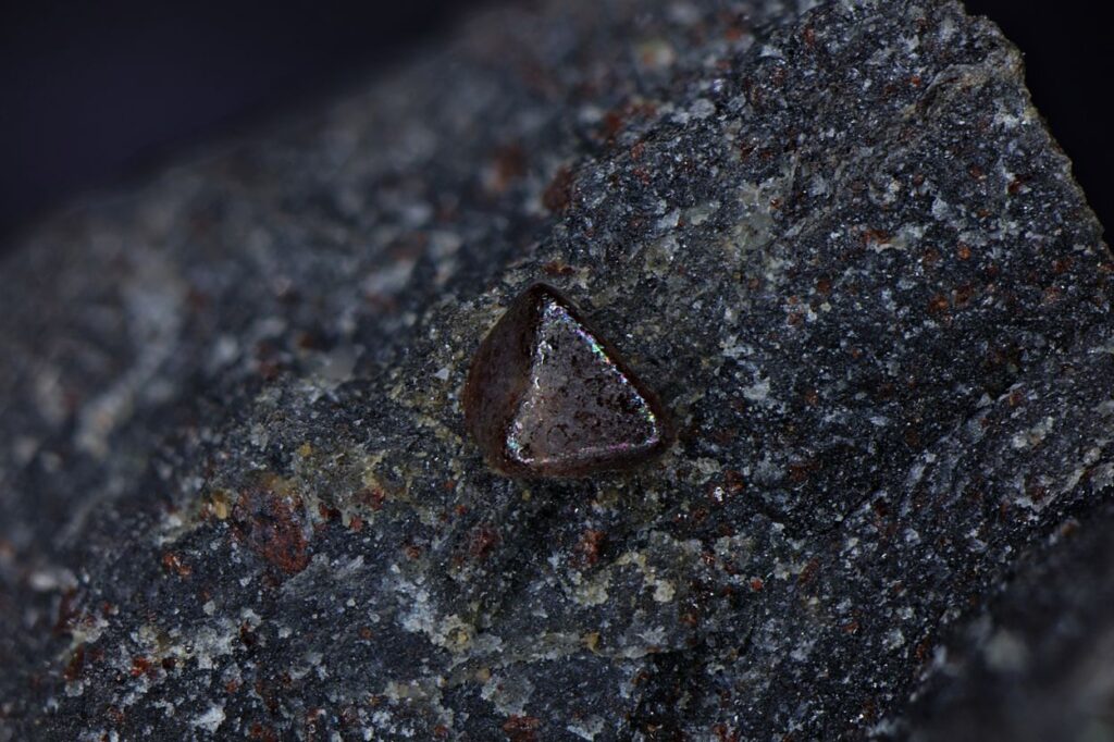 9012 JP2963 Zircon, Middle Hill, Mount Anakie, Anakie, City of Greater Geelong, Victoria May 27, 2020 Pendleton Australasia Australia Victoria Although not that uncommon, zircon xenocrysts that have come up as part of the molten material are usually hard to spot. This zircon has only been affected a little. It also exhibits a nice rainbow effect around the edges.