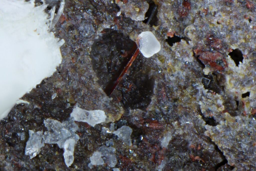 ncat JP3546 Dolomite, Pseudobrookite, Mount Shadwell, Mortlake, Moyne Shire, Victoria November 12, 2022 Pendleton Australasia Australia Victoria A tiny dolomite crystal perched on the end of a pseudobrookite crystal. Ex Jo Price Collection. Width of view 1.75mm. Stack of 42 images. Click on the image below for a higher resolution version.