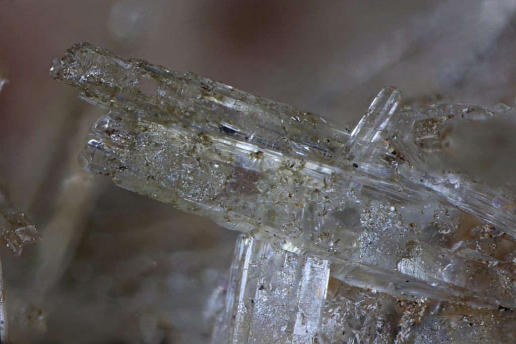 Ugly looking aragonite crystals that appear to have been partially etched giving them a greyish appearance, and then clear colourless tips have been added to the terminations. From an old locality. Ex Jo Price Collection. Width of view 3.5mm. Stack of 30 images.