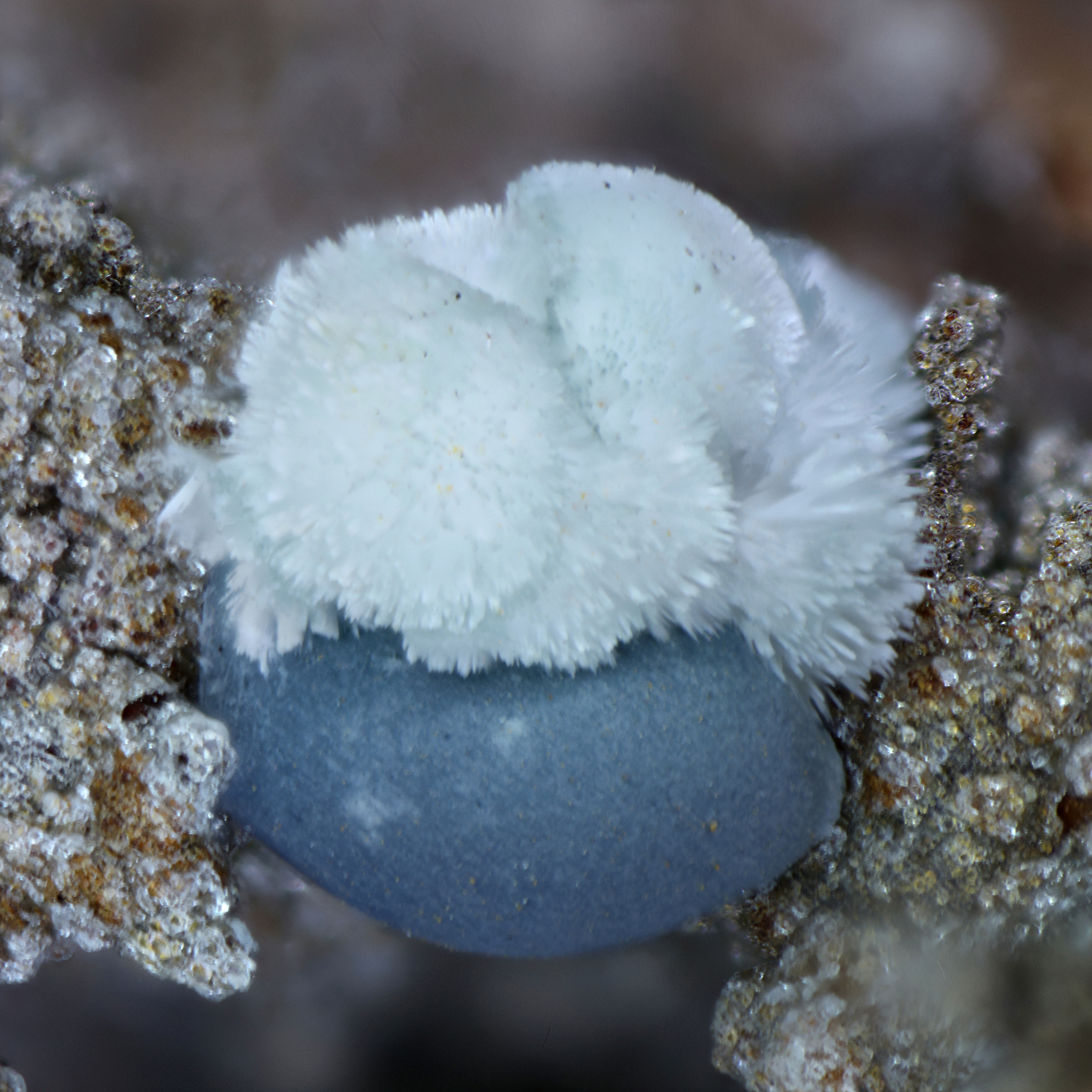 4598 Dundasite, Rosasite, Juanita Mine, Magdalena, Socorro Co., New Mexico, USA May 13, 2018 Pendleton New Mexico North and Central Americas United States White tufts of dundasite sit atop a ball of rosasite on this specimen originally mounted by the late Micromount Hall of Famer, Bill Henderson. Photo width is 3.33mm. Click for full sized imageā¦