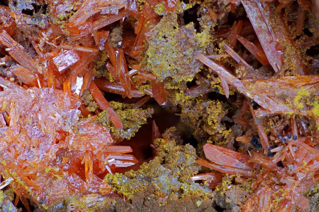 2864 NA Crocoite, Bindheimite, Callenberg, Zwickau District, Saxony, Germany September 19, 2023 Pendleton Europe Germany Vughs with crocoite crystals in a massive piece of crocoite, with yellow powdery coatings and small crystals of bindheimite. Width of view 11.5mm. Stack of 61 images. Click on the image below for a higher resolution version.