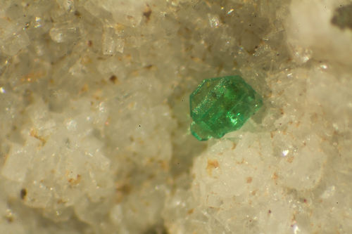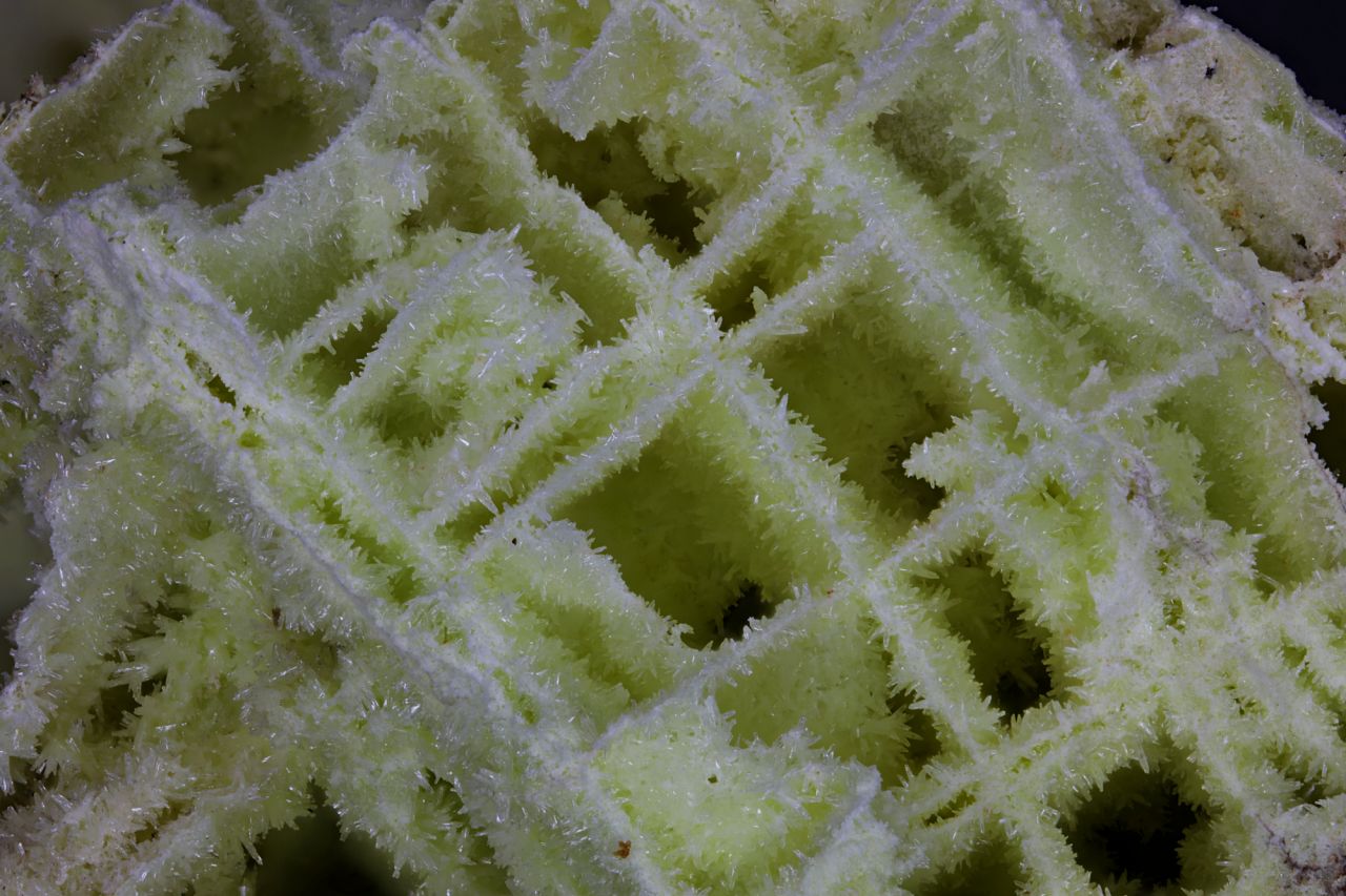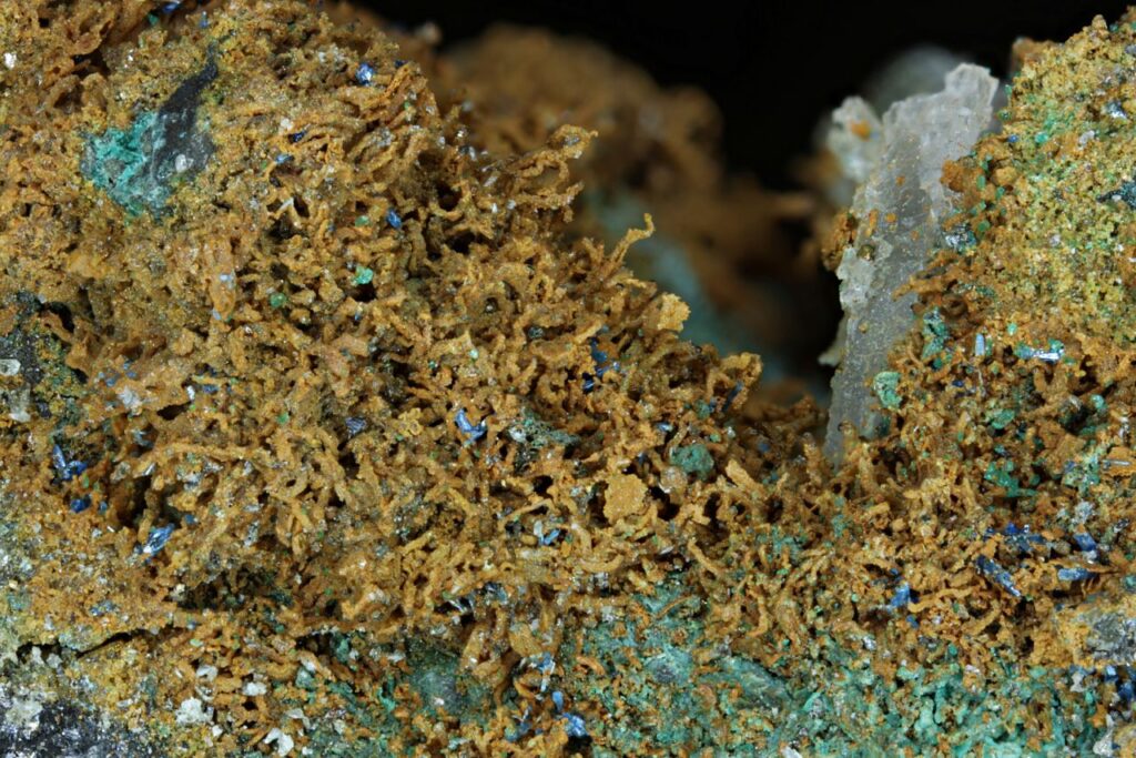 Tiny blue linarite crystals with green brochantite, white cerussite and possible ktenasite. Unidentified brown pseudomorph(?), perhaps originally a chlorite mineral? Width of view 6mm. Stack of 110 images.