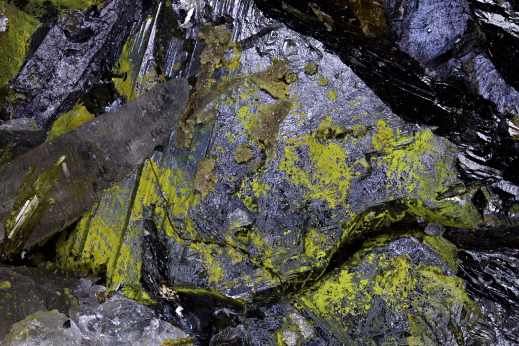 Greenockite as a yellow coating/exsolution on sphalerite crystals. Some tiny orange crystals of greenockite evident particularly in the bottom left-hand quadrant (zoom in to explore). Width of view 7.75mm. Stack of 40 images.