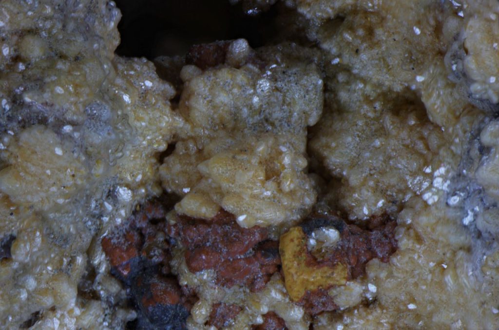 3563 Monteponite, Smithsonite, Monteponi Mine, Iglesias, South Sardinia Province, Sardinia, Italy December 2, 2021 Pendleton Europe Italy Type Locality Type Locality for monteponite. Tan smithsonite with yellow and brown monteponite. Width of view 3.5mm. Stack of 30 images. Click on the image below for a higher resolution version.