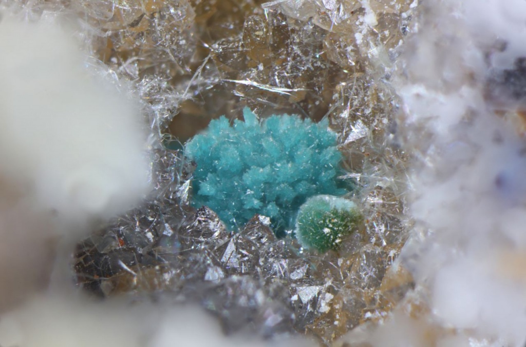 Quite a bit going on here. In the centre is light blue aurichalcite on a darker blue hemisphere of rosasite (there is a second hemisphere behind and to the left as well). In front to the right is a more greenish aurichalcite. And then there are wispy almost colourless strands of aurichalcite around the group. All of this on a bed of quartz. Ex Joan Lamond Micro Collection. Acquired by Joan from Graham Lee in 2001. Width of view 3.5mm. Stack of 40 images.