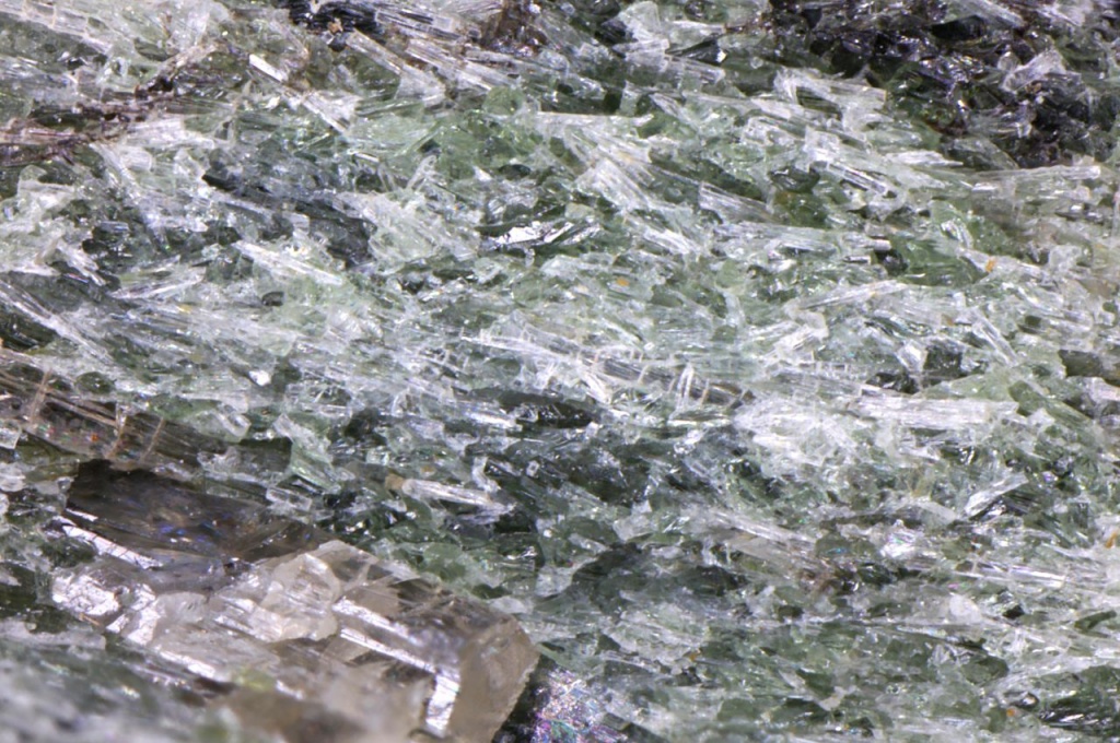Colourless to green prismatic crystals all generally oriented in the one direction. Width of view 3.5mm. Stack of 25 images.