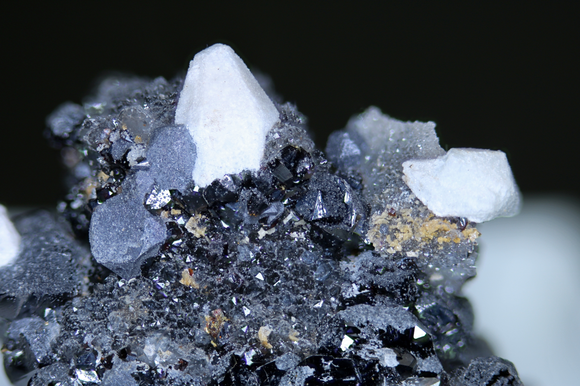 Double-terminated alstonite crystal group on a sulphide matrix (sphalerite, pyrite and galena). Also present but not in photo are twinned harmotome crystals. The sphalerite is providing the orange colour in the alstonite crystals. Width of view 3.5mm. Stack of 40 images. Click on the image below for a higher resolution...