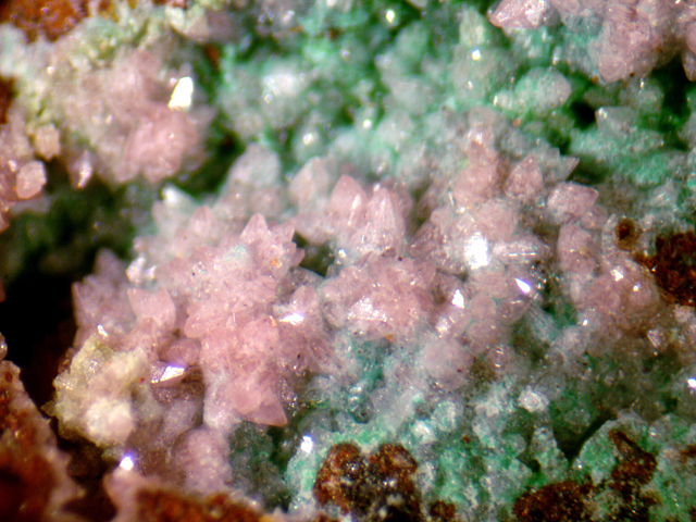 Green spheres are more likely conichalcite than cornwallite as labelled (conichalcite recorded in the Simpson Collection in Western Australia). Width of view 11.5mm. Stack of 35 images. Click on the image below for a higher resolution version.