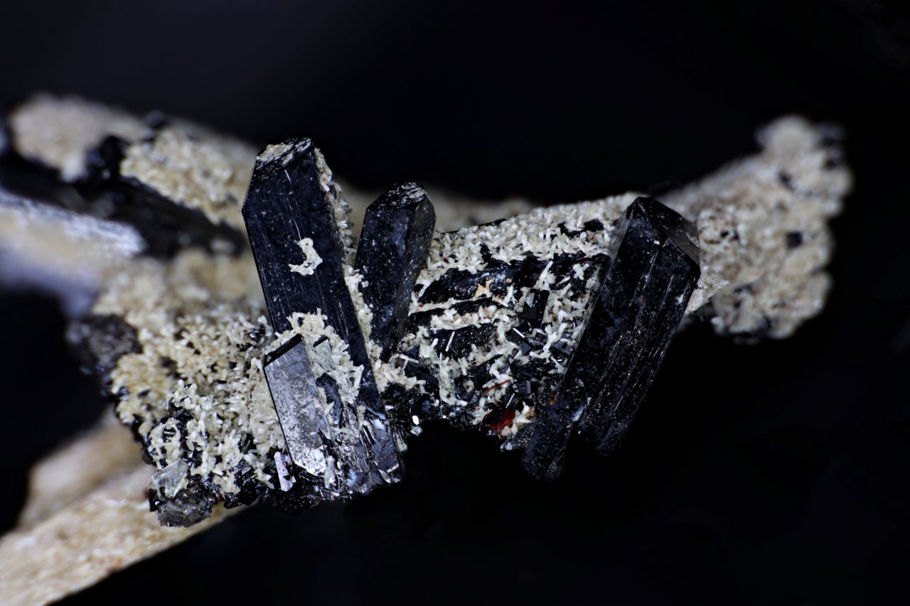 Tiny pale calcite crystals on black manganoneptunite. Width of view 17.25mm. Stack of 30 images. Ex Joan Lamond Collection. Acquired by Joan in 1996. Ex Museum Victoria. Collected by Bill Birch. Click on the image below for a higher resolution version.