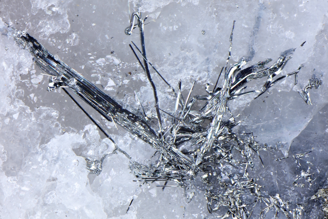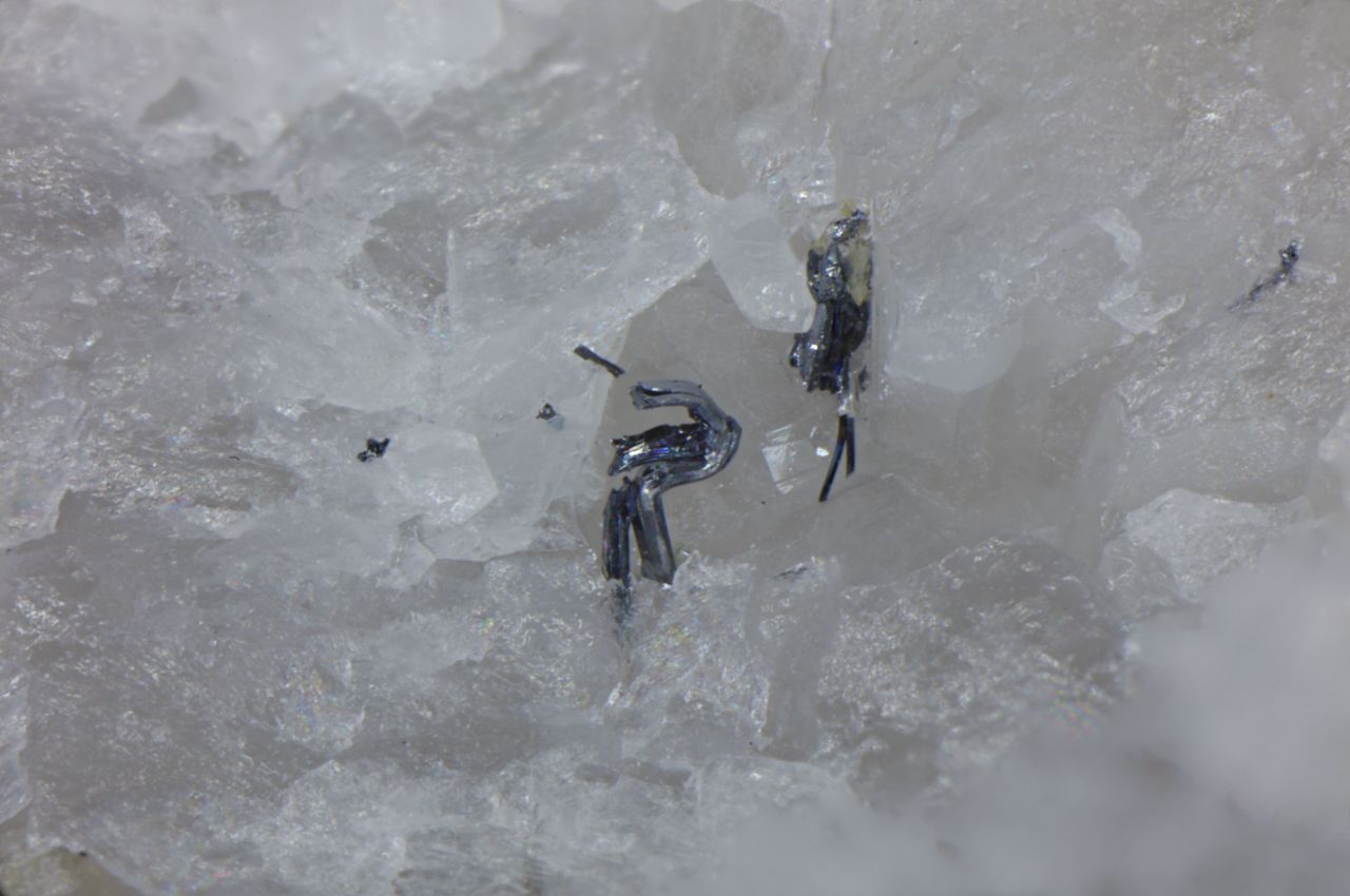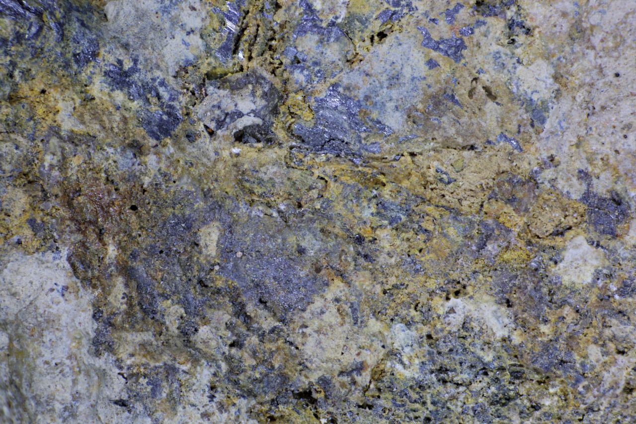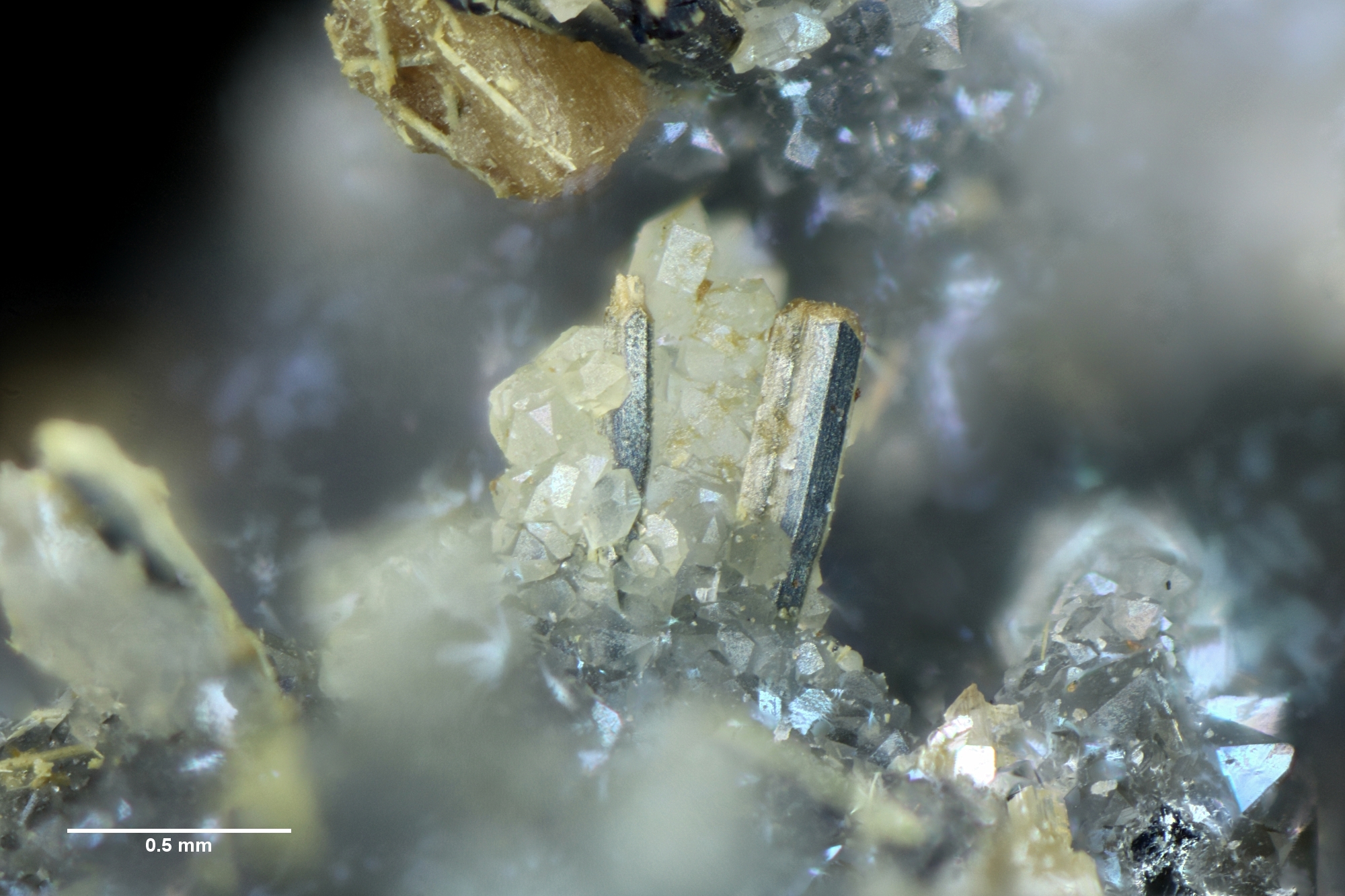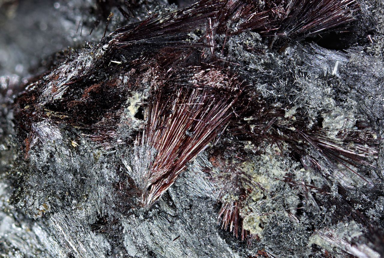 Spongy reddish gold that results possibly from the breakdown of aurostibite(?) with small areas of more yellow native gold, and silver stibnite. Collected by me in the early 1990s. Width of view 3.5mm. Stack of 30 images. Click on the image below for a higher resolution version.