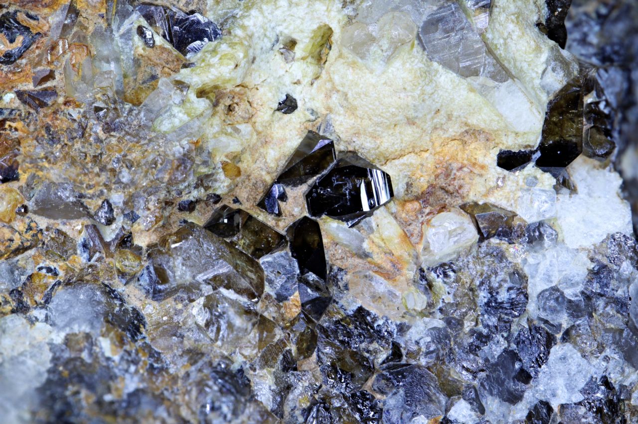 Brown topaz crystals embedded in white kaolinite on the side of a quartz crystal. Width of view 6mm. Stack of 32 images. Click on the image below for a higher resolution version.